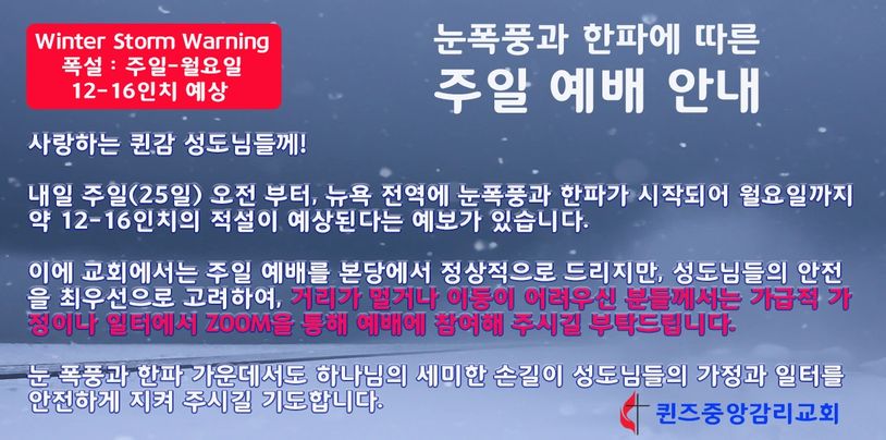 2026년 눈폭풍과 한파에 따른 주일 예배 안내