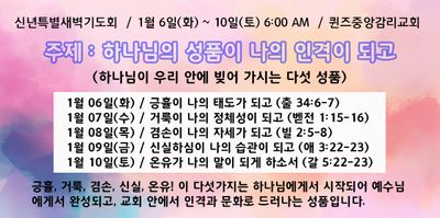이번 한 주, 이런 “작은 거룩”의 훈련을 함께 실천해 보았으면 좋겠습니다. 아침 첫 말을 기도로 시작하기, 대화 중 험담 피하고 축복의 말 건네기, 하나님 앞에서 ‘한 가지’ 끊어낼 것 결단하기…등등 올 한 해 하나님을 닮은 거룩한 성품으로 빚어져 가는 우리 퀸감 공동체 되시길 빕니다.